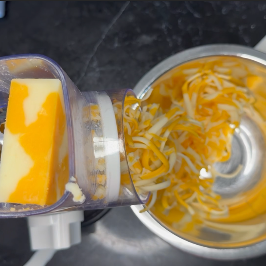 Step 1: Heat your oven to 350° and shred your cheese. I went with cheddar jack, but you can also do feta, gruyere, gouda, or any you love.