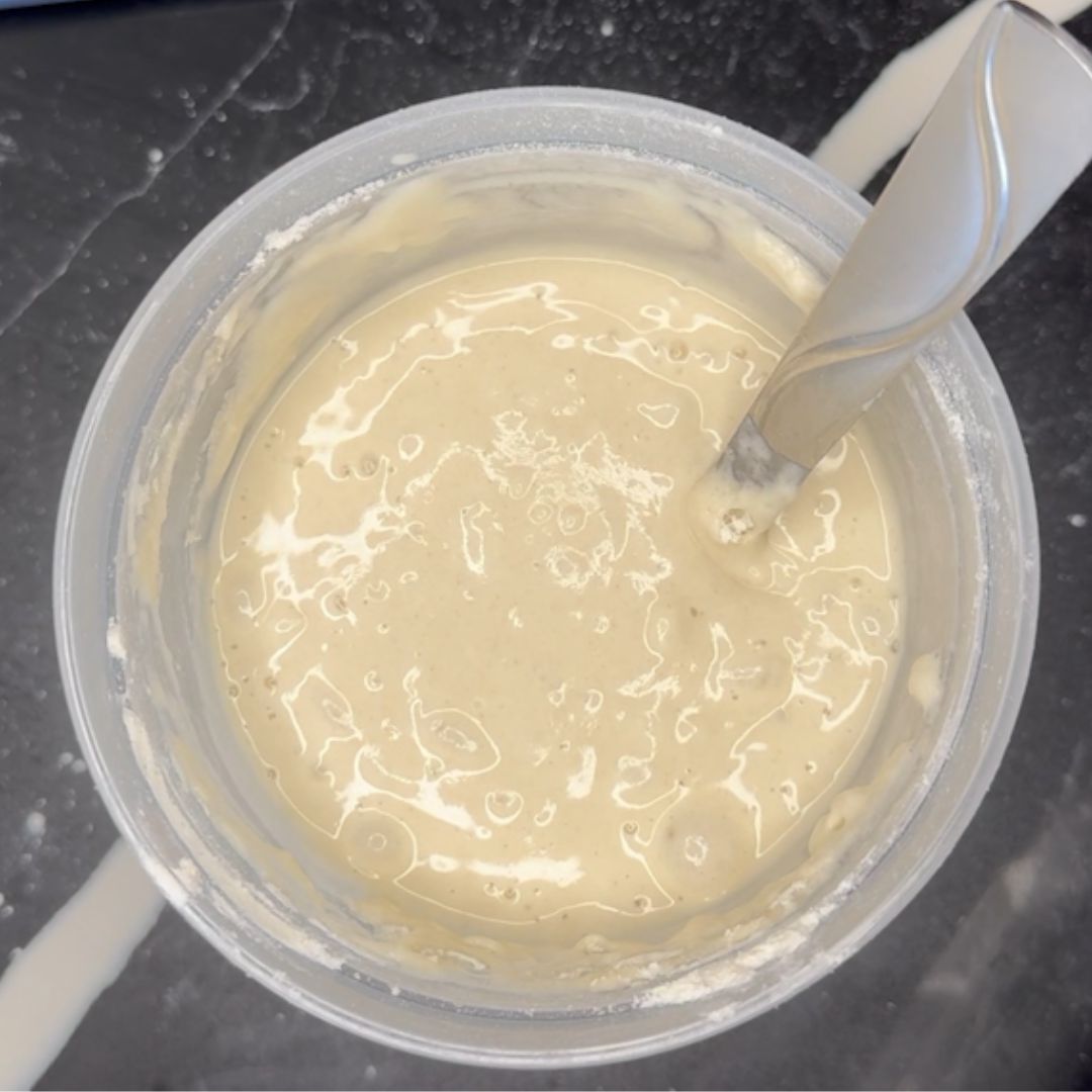 Step 5: Stir the pancake mix with water until the large lumps are gone. Don’t beat or over mix, there should still be lumps. Then let it stand to thicken.