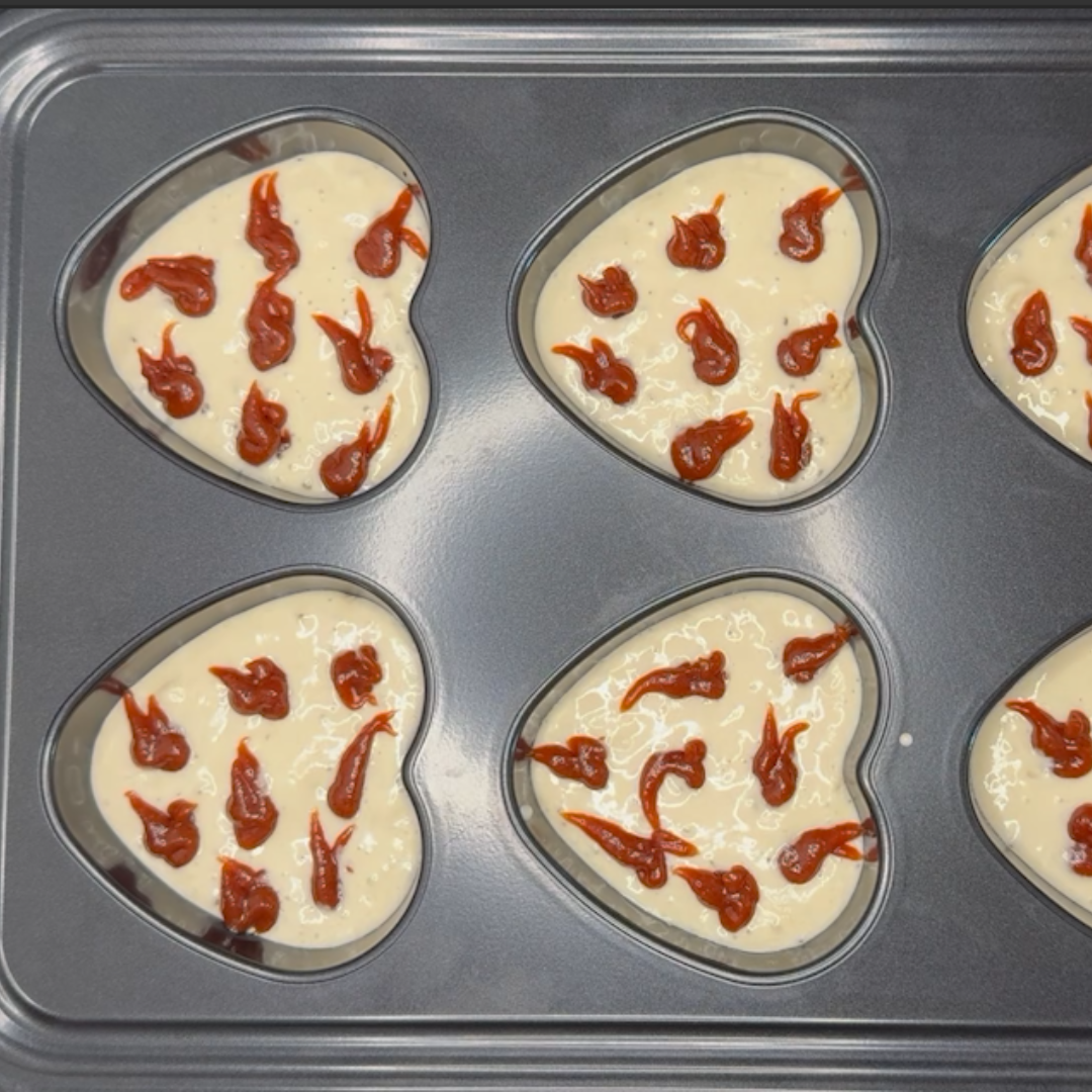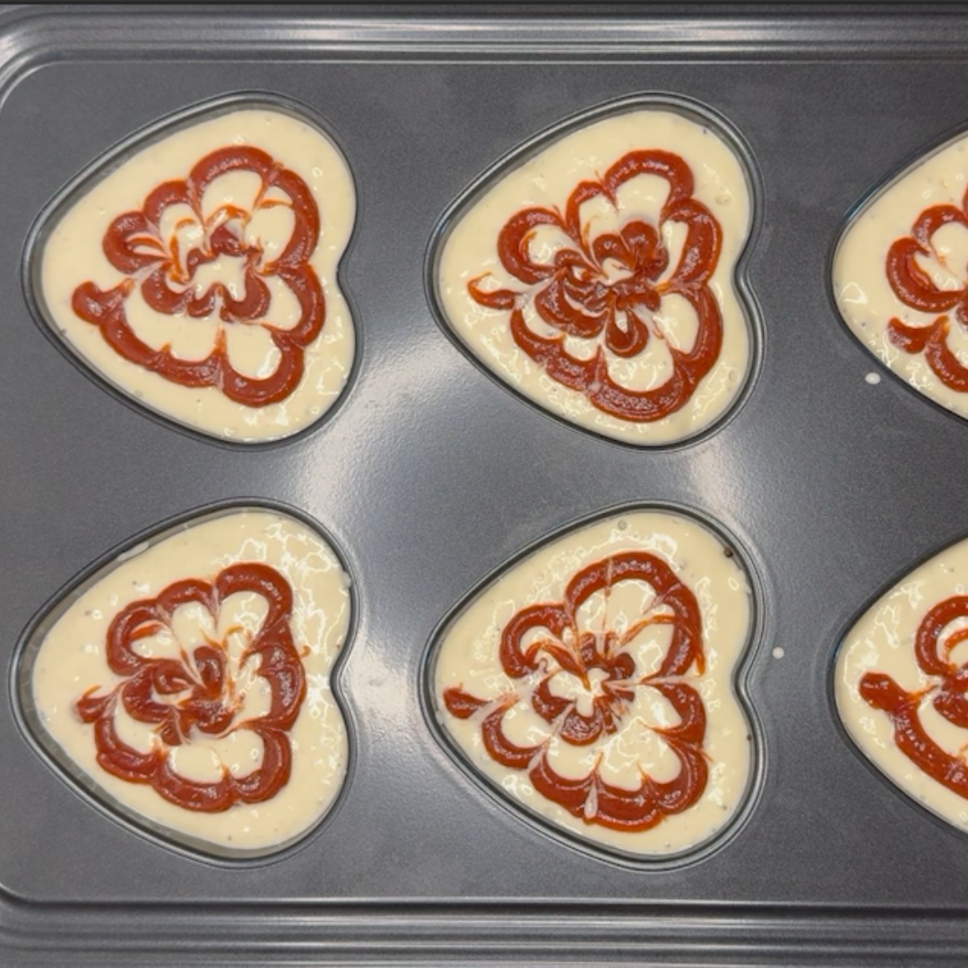 Step 9: Over the top layer of the pancake mix, create a swirl of guava, or any shape or design you wish. These were created with a toothpick.