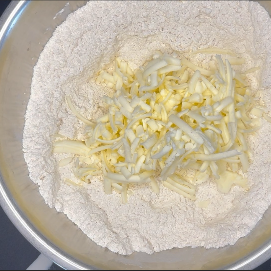 Step 2: Add the grated butter and combine with hands until it creates small crumbles.
