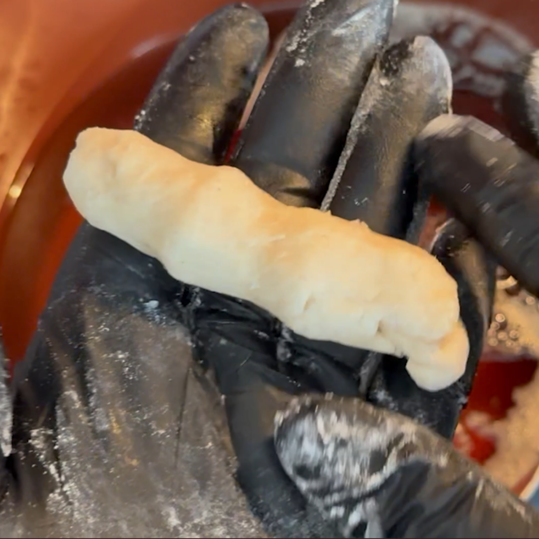 Step 6: Using floured hands to prevent sticking, pinch off small pieces of dough and form into cylinders.